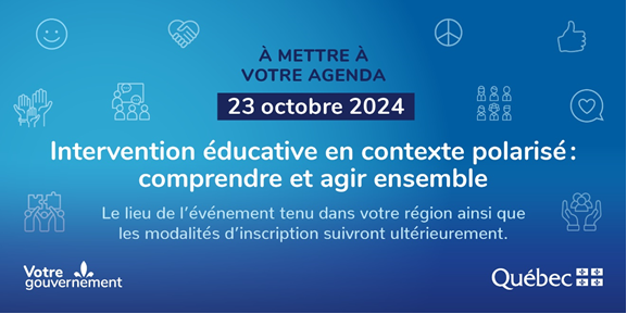 Vous êtes invités à réserver dès maintenant à votre agenda le 23 octobre 2024, date à laquelle se déroulera l’activité Intervention éducative en contexte polarisé comprendre et agir ensemble.